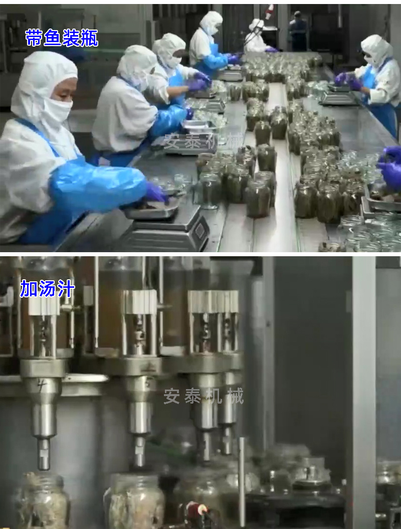 解凍——切斷——清洗——腌制——烘干——油炸——浸湯汁——裝罐(裝瓶)——真空封罐——高溫殺菌鍋——噴碼——裝箱——碼垛