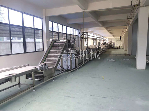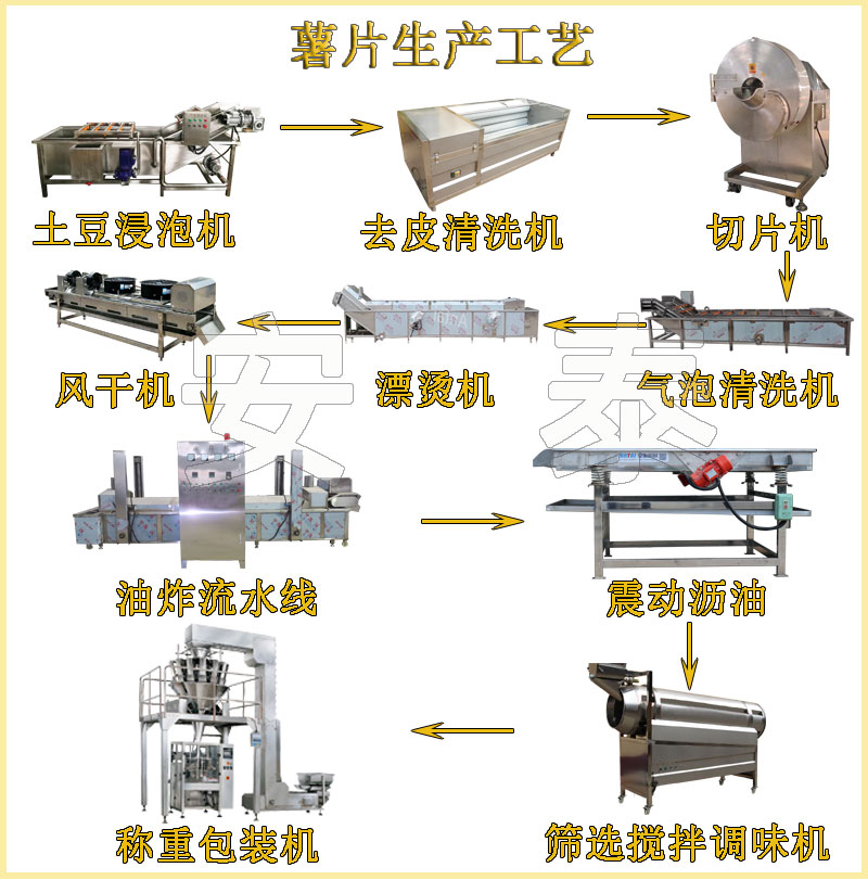 薯片工藝流程:土豆浸泡機(jī) —— 上料提升機(jī)—— 清洗去皮機(jī) —— 挑揀線 —— 提升機(jī) —— 切片機(jī) —— 漂洗線 —— 風(fēng)冷瀝水機(jī) —— 油炸線 —— 振動(dòng)瀝油機(jī) —— 調(diào)味拌料機(jī)—— 稱重包裝機(jī)